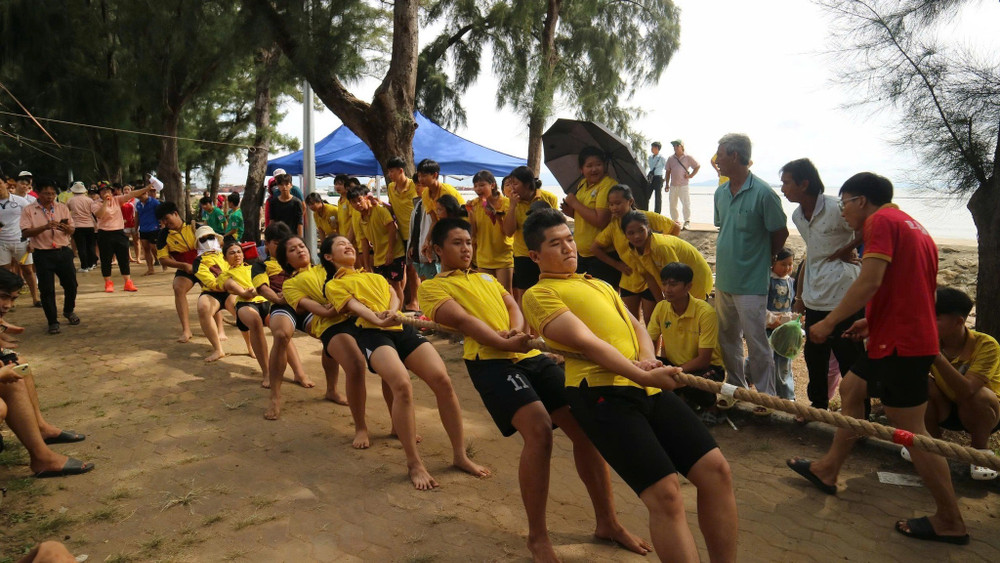 Không khí rộn ràng với tiếng cười nói, màu sắc rực rỡ của đèn lồng đỏ, câu đối xuân và những gian hàng trang trí bắt mắt tạo nên nét văn hóa đặc trưng của Tết miền biển.